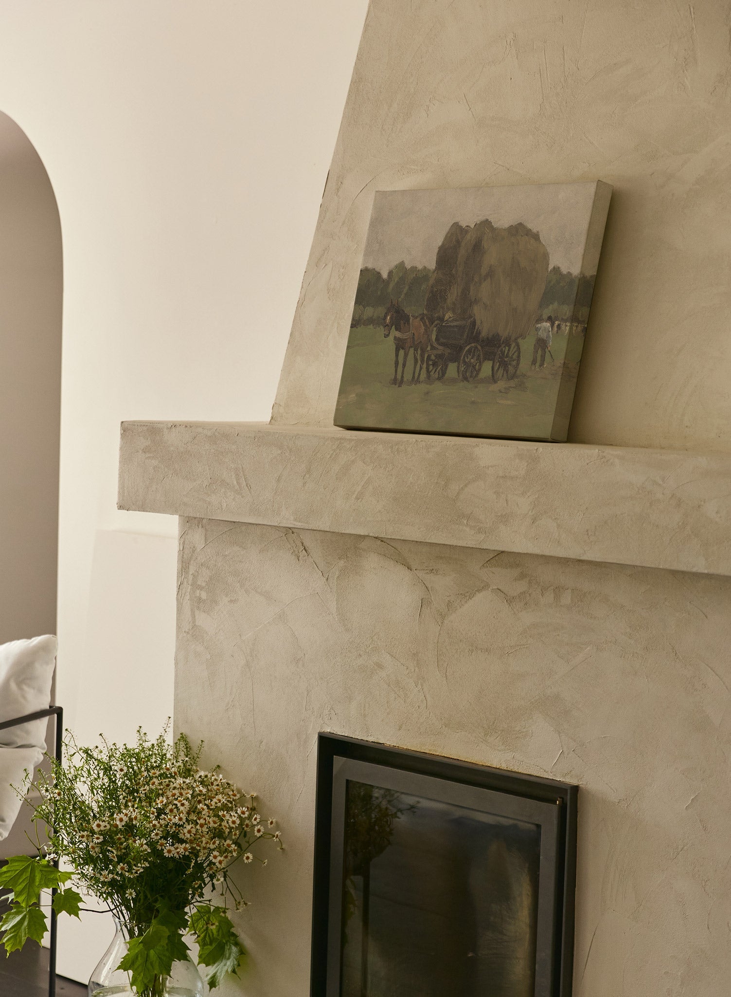 Nicolaas Bastert’s ‘Hay Wagon’ depicts a charming rustic scene of a horse pulling hay in a carriage on a lush green farm.