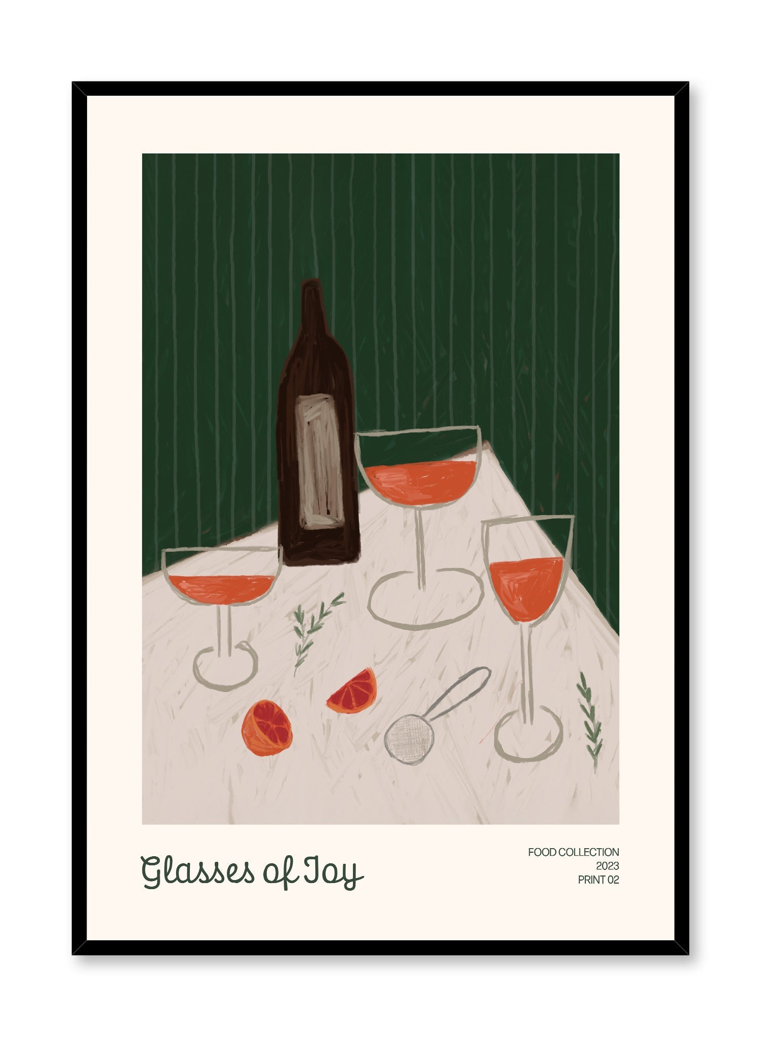 ‘Rosemary & Rosé’? Sounds like the perfect night to us! Savor this colorful illustration of rosé wine glasses and rosemary leaves set on a white table in front of a striped emerald green wall.