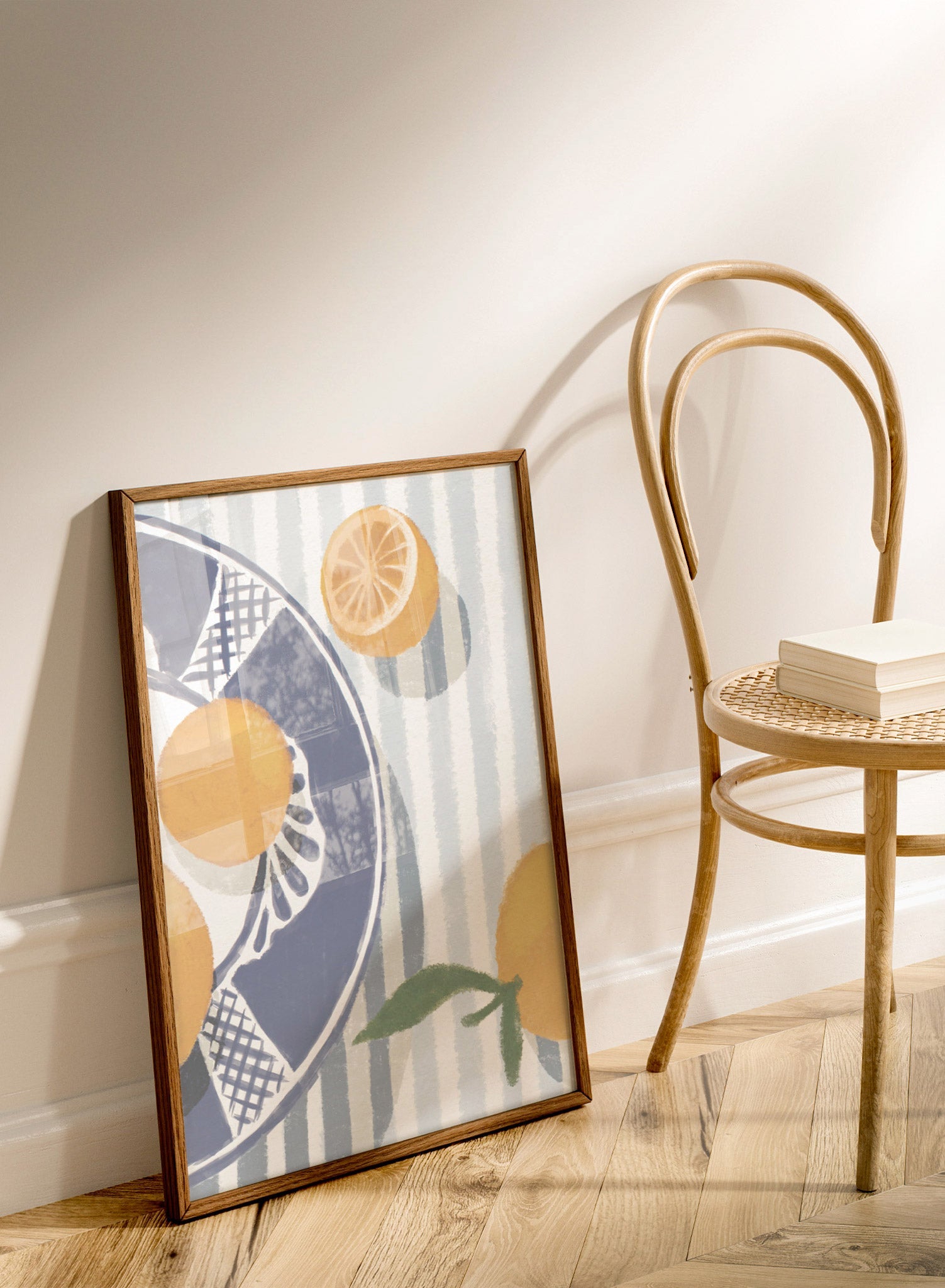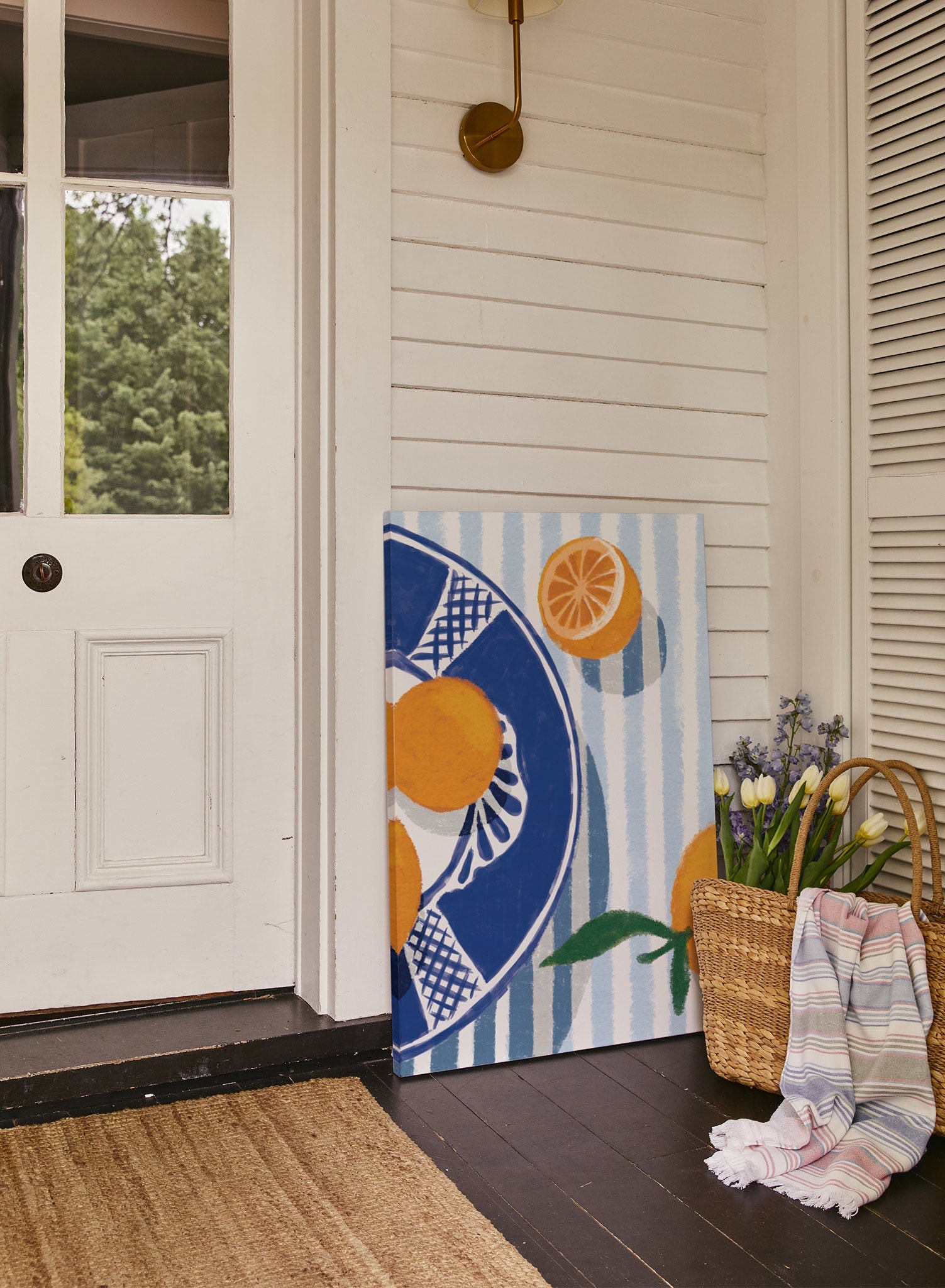 ‘Runaway Clementine’ sparks joy in our hearts and in our kitchen!This colorful painting shows bright orange clementines on a blue and white dish and a striped tablecloth.