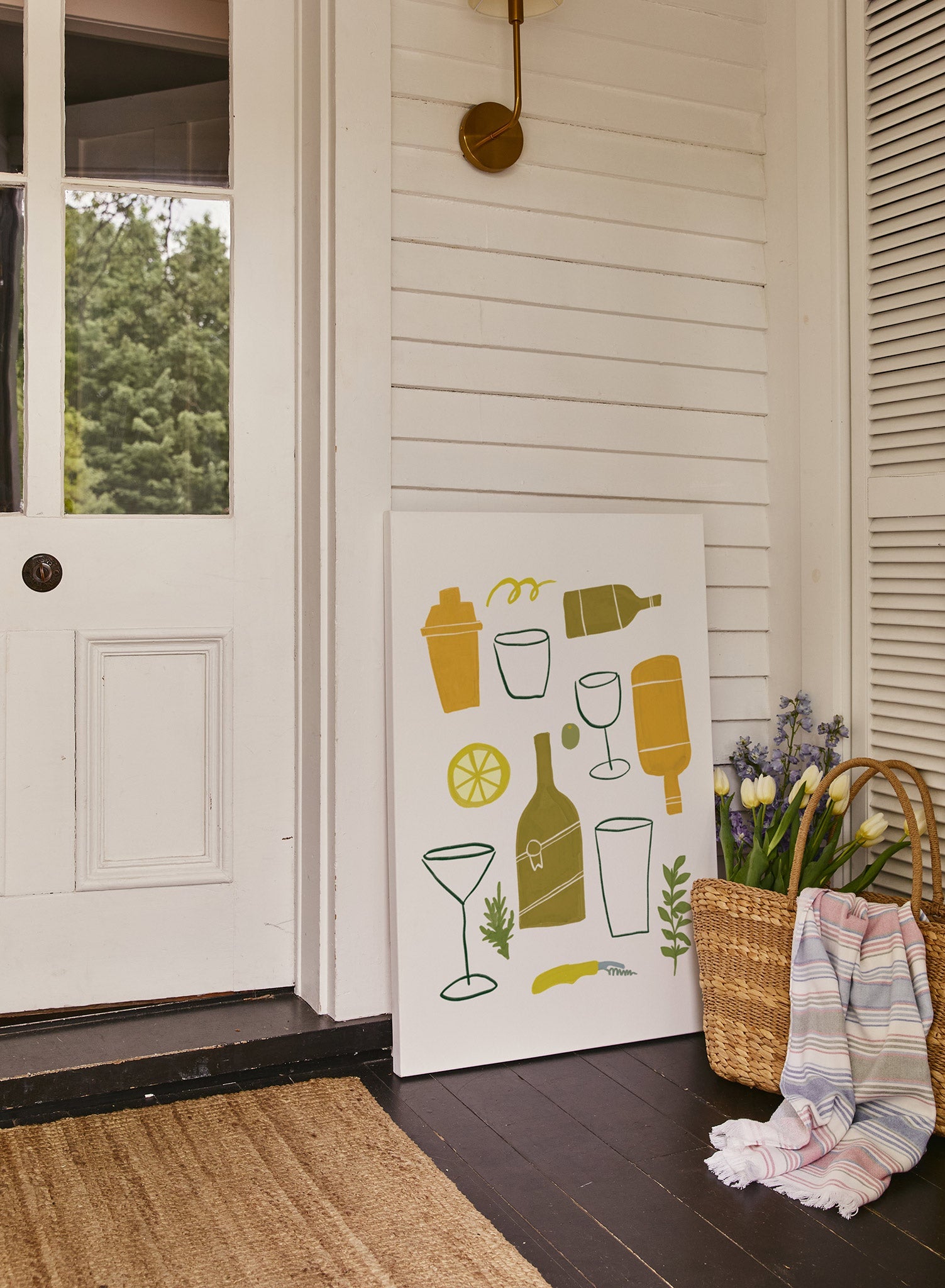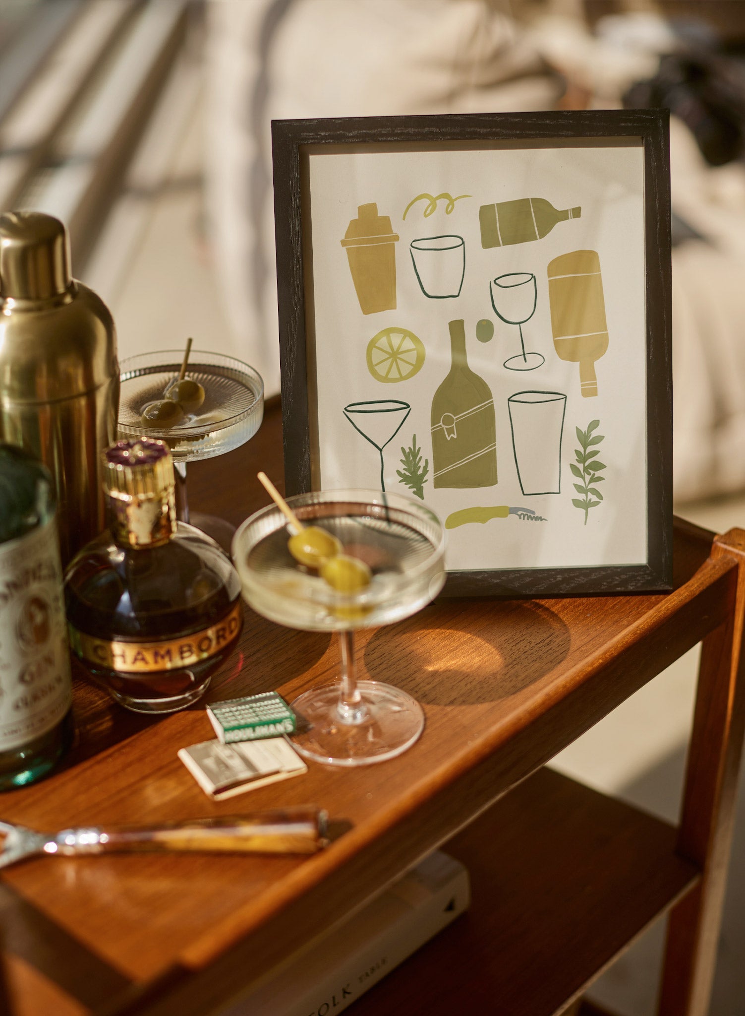 ‘What’s Shaking?’ you ask? A fabulous cocktail, thanks to these bartending essentials! This yellow and green illustration includes a shaker, bottles, glasses and delicious drink ingredients.